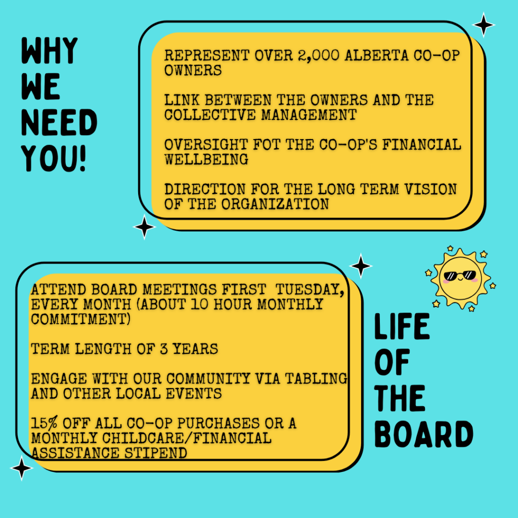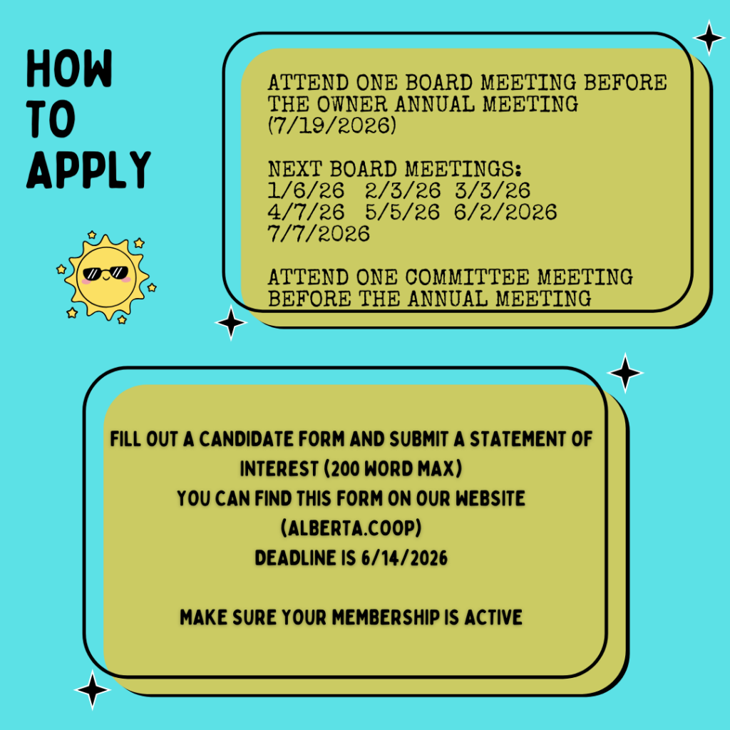 To attend one of these board meetings and/or to find out when the next committee meetings are, please email: board@albertagrocery.coop